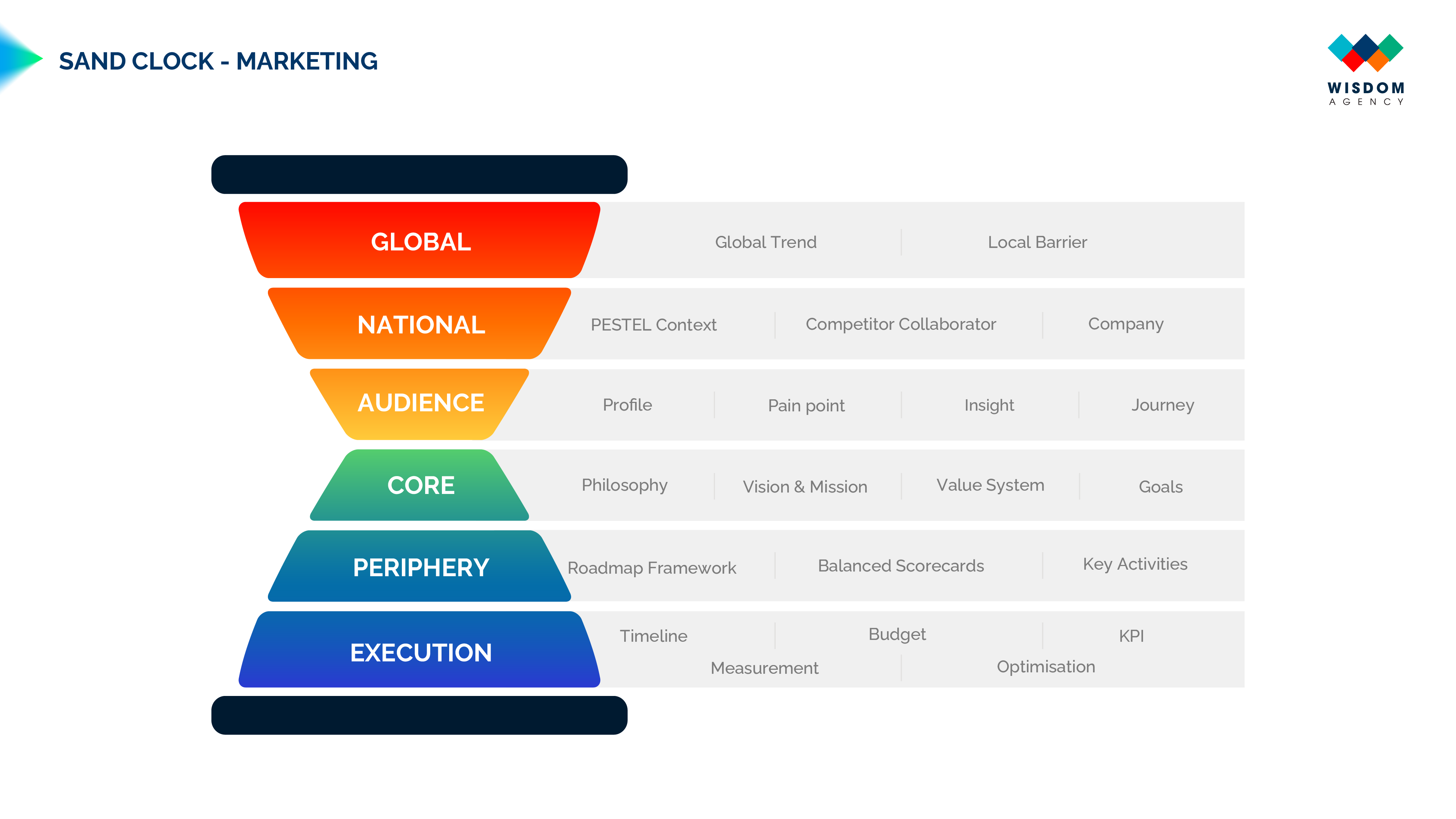 Đó là lý do tất cả các dự án tại Wisdom đều khởi động từ mô hình SandClock. Với framework đồng hồ cát, mô hình dẫn dắt chắt lọc dữ liệu qua các tầng quyết định chiến lược, từ bối cảnh thị trường đến nền tảng thương hiệu, và cuối cùng là thực thi marketing có kiểm soát.