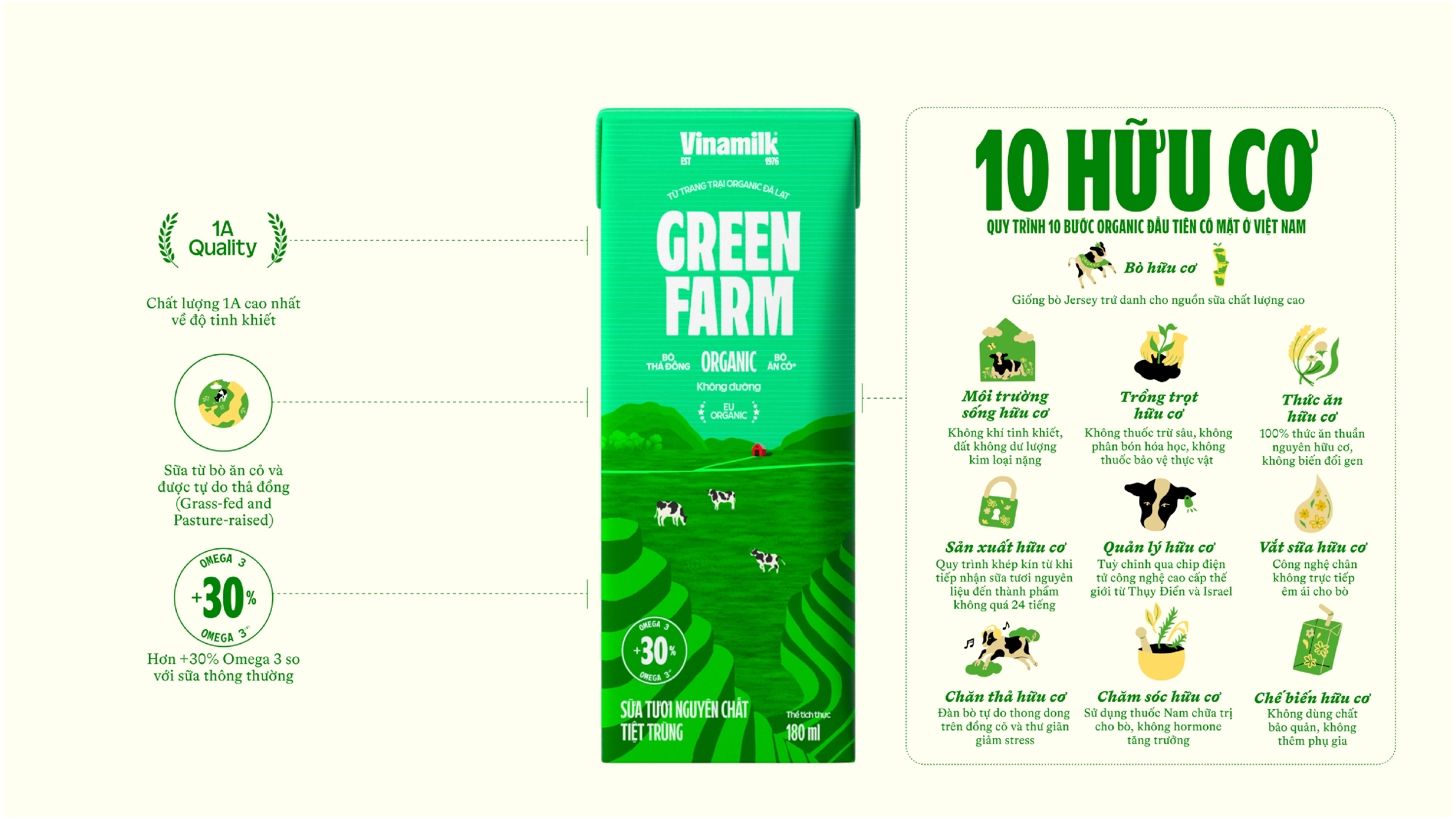 - Trải nghiệm: cảm giác an tâm khi biết ly sữa đến từ trang trại xanh mát, nơi bò được chăm sóc phúc lợi tốt (bò được thả tự do – grazing).